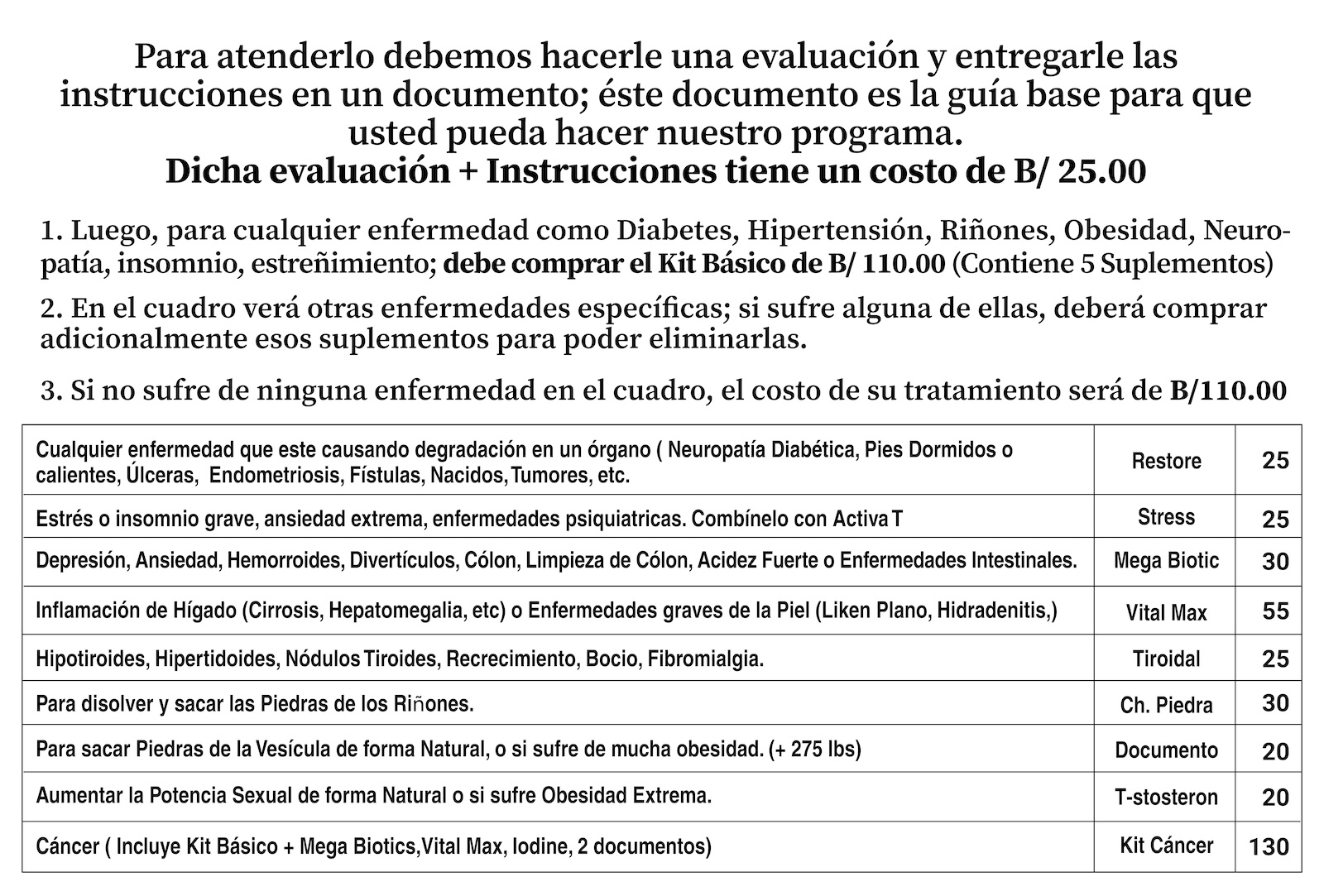1. Luego, para cualquier enfermedad como Diabetes, Hipertensión, Riñones, Obesidad, Neuropatía, insomnio, estreñimiento; debe comprar el Kit Básico de B/ 110.00 (Contiene 5 Suplementos).