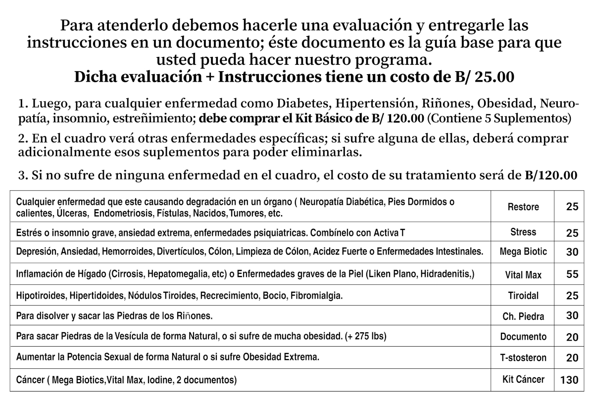 1. Luego, para cualquier enfermedad como Diabetes, Hipertensión, Riñones, Obesidad, Neuropatía, insomnio, estreñimiento; debe comprar el Kit Básico de B/ 120.00 (Contiene 5 Suplementos).